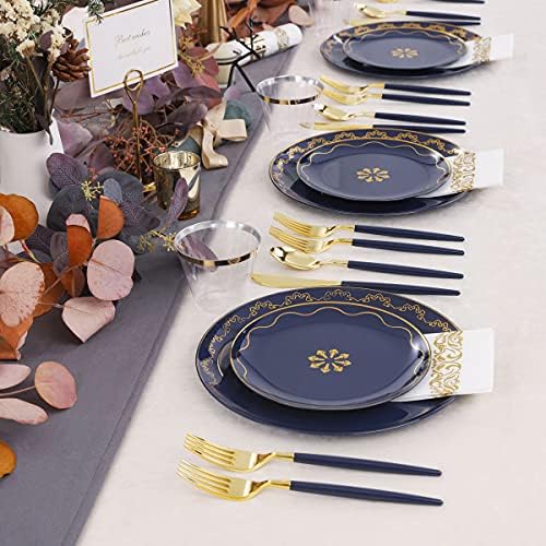 Ciaell 175PCS Blue Plastic Plates & Gold Plastic Silverware – Gold Plastic Plates embody 25Dinner Plates, 25Dessert Plates, 25Knives, 25Forks, 25Spoons, 25Cups, 25Napkins Excellent for Occasion & Wedding ceremony