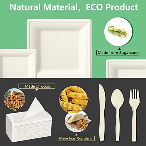 Compostable Disposable Paper Plates Set -[300 Pcs]10 inch 8 inch Heavy Obligation Biodegradable Sq. Plates and Spoons,Forks,Knives,Napkins-Eco-Pleasant Dinnerware Set for Events,Tenting