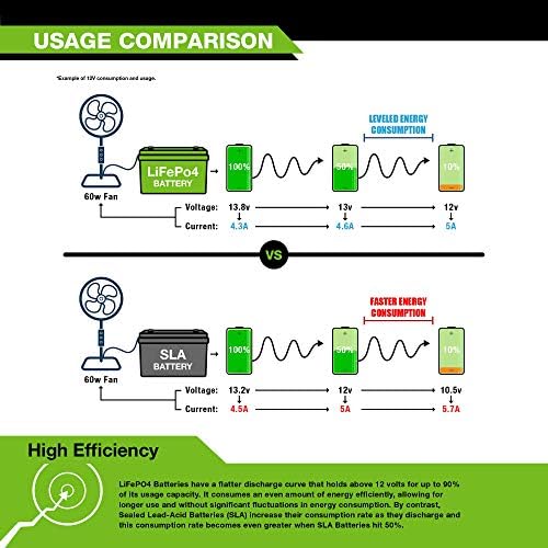 Environment friendly Energy: Our LiFePO4 battery’s flat discharge curve holds above 12V for as much as 95% of its capability utilization offering astronomical boosts in run-time in comparison with solely 50% in Lead Acid.