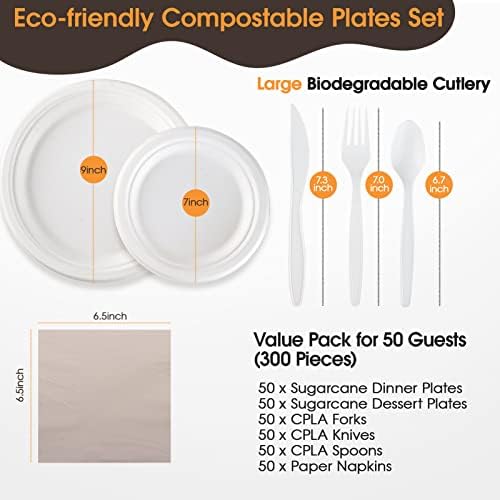 【300 Items Dinnerware Set】Contains 50 – 9″ disposable paper dinner plates, 50 – 7″ paper dessert plates, Biodegradable CPLA cutlery(50 – 7″ forks, 50 – 7.3″ knives, 50 – 6.7″ spoons) and 50 – 6.5*6.5″ paper napkins. Eco-Pleasant sugarcane tableware set mean you can serve 50 friends completely