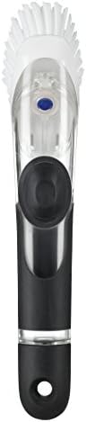 This Set pairs the Good Grips Cleaning soap Allotting  Dish Brush with a helpful holder that retains it able to go for the following soiled dish. The OXO Good Grips Cleaning soap Allotting Dish Brush Storage Set features a Cleaning soap Allotting Dish Brush with sturdy nylon bristles to wash away meals and grease, and a built-in Scraper on the again to simply take away baked-on meals. A companion holder shops the Brush upright and neatly catches extra water, maintaining the deal with dry and the Brush conveniently inside attain. The holder encompasses a detachable drip tray and built-in pour spout to maintain counter tops clear and dry. A non-skid base retains the holder securely in place. The Brush and Scraper are secure to make use of on non-stick cookware.