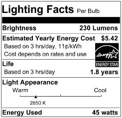 45 Watts, 230 lumens on 130 volt circuits, when used on 120 volt circuits makes use of 40 watts and produces 220 lumens