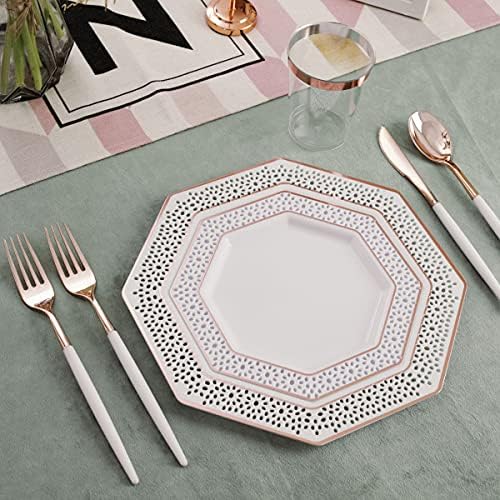 WELLIFE 150 PCS Rose Gold Plastic Plates with Disposable Silverware, Rose Gold Plastic Cutlery with White Deal with, Consists of:30 Dinner Plates, 30 Dessert Plates, 30 Cutlery